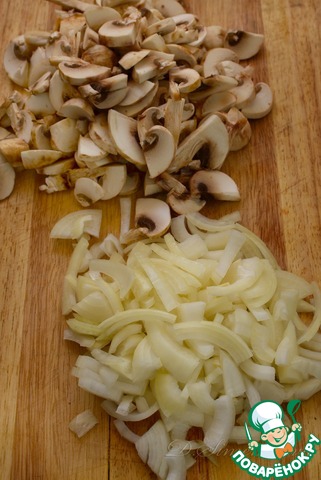 Пока рыба готовится можно подготовить продукты для соуса, нарезать лук и шампиньоны довольно крупно. Порезать помидоры, зелень..