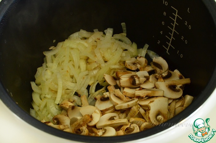 На оставшемся растительном масле обжарить лук и грибы в режиме Поджаривание около 10 минут.