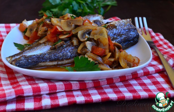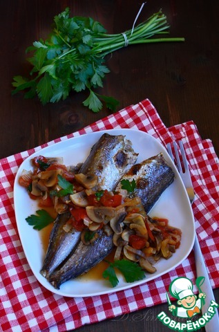 Выкладываем тушки хека на блюдо и сверху этот аппетитно-вкусный соус. Посыпаем петрушкой.