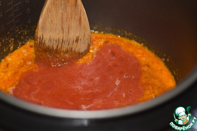 Включить режим "ТУШЕНИЕ", выставить время - 40 минут. Томаты в собственном соку измельчить в блендере до пюреобразного состояния.