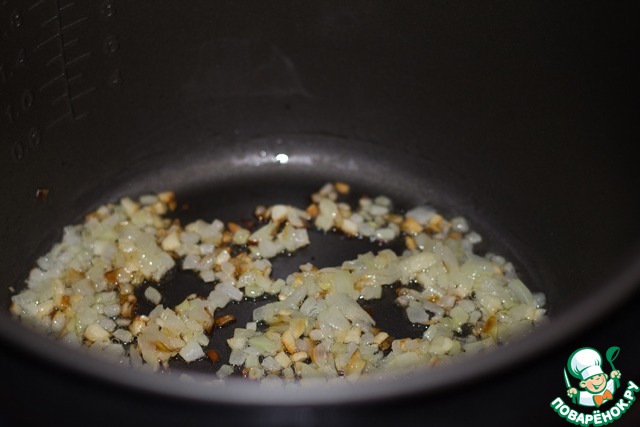 Мелко нарезать лук и чеснок. Включить режим "ЖАРКА", выставить время - 20 минут. Налить в чашу 1 ст. л. оливкового масла и жарить лук с чесноком, помешивая, в течение 10 минут, до золотистого цвета.