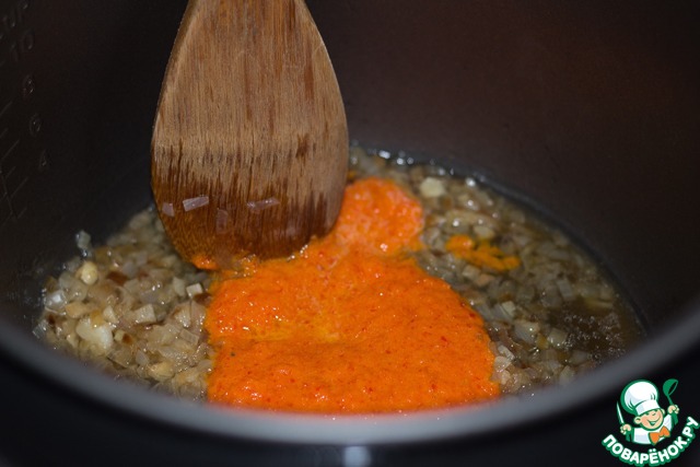 Добавить к луку и чесноку, перемешать, продолжать обжаривать до окончания программного времени.