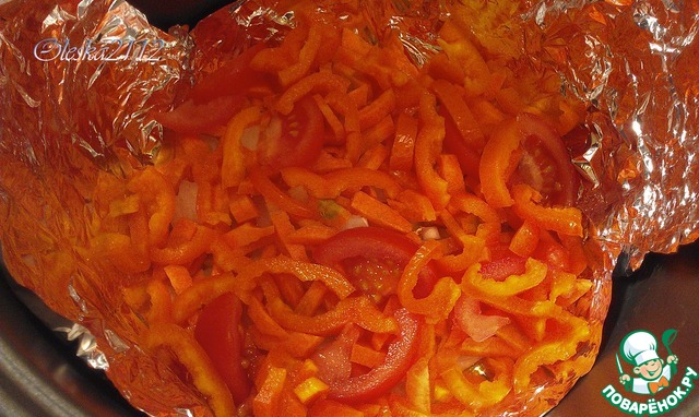 Дно чаши для мультиварки застелить фольгой (с бортиками). Смазать оливковым (или другим растительным маслом). Выкладываем слоями: лук, морковь, перец сладкий, помидор. Сверху овощей выкладываем порционные кусочки рыбы.