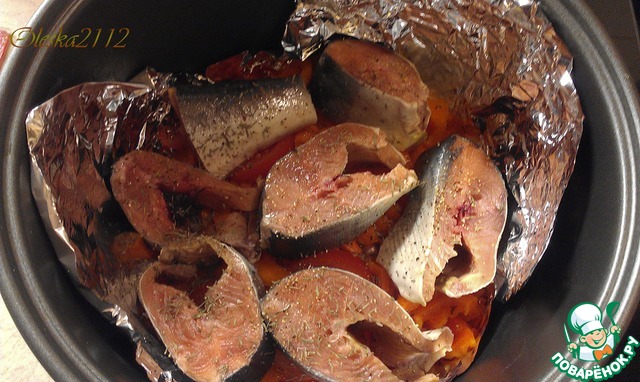Фольгой накрываем нашу рыбу с овощами. Закрываем крышку мультиварки и устанавливаем программу "ВЫПЕЧКА", 50 минут.