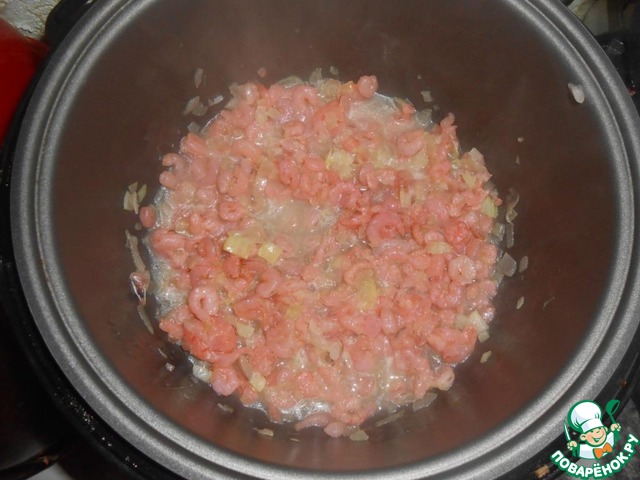 Креветки добавить к луку, продолжать жарить еще 10 минут
