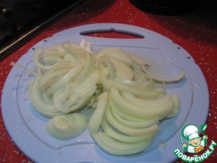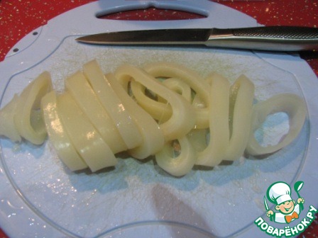 Размораживаем кальмары, опускаем в горячую воду и снимаем самую тонкую прозрачную пленку. Режем кольцами по 1 см.