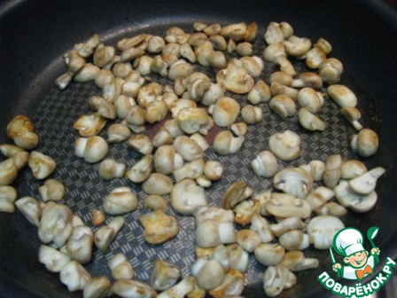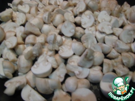 Моем шампиньоны, промокаем бумажным полотенцем, и в зависимости от размера нарезаем на части (не мелко)