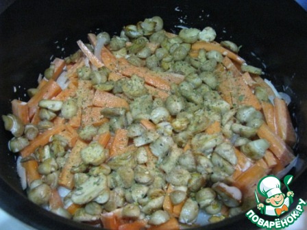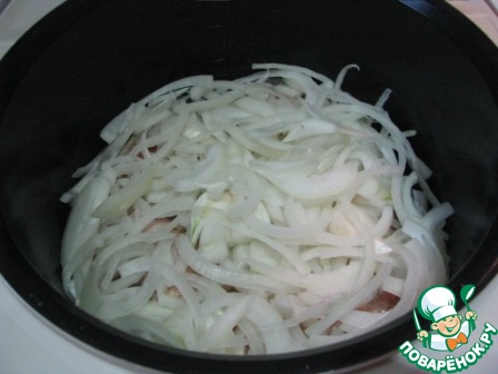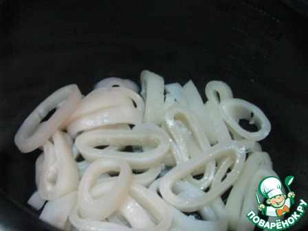 Смазываем чашу сливочным маслом и укладываем слоями. Сначала кальмары