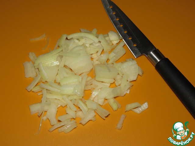 Мясо порезать на небольшие кусочки, при необходимости удалив с них лишний жир и прожилки.