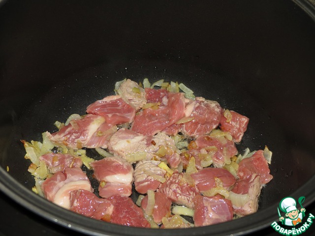 Добавить порезанное мясо к луку и обжаривать под закрытой крышкой пятнадцать минут.