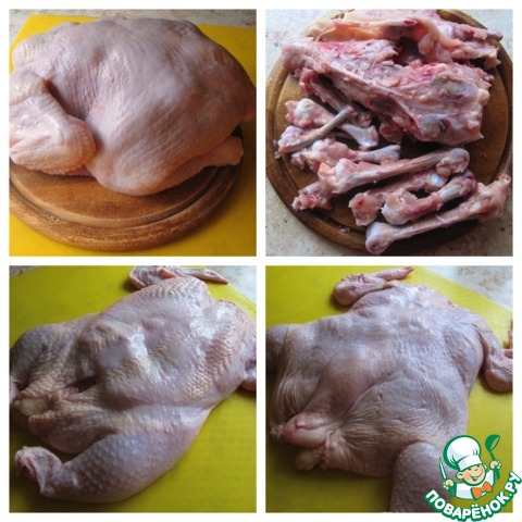Из тушки курицы нужно аккуратно извлечь косточки, не делая разрезов. Я воспользовалась видео уроком, процесс извлечения косточек занял 15 минут.