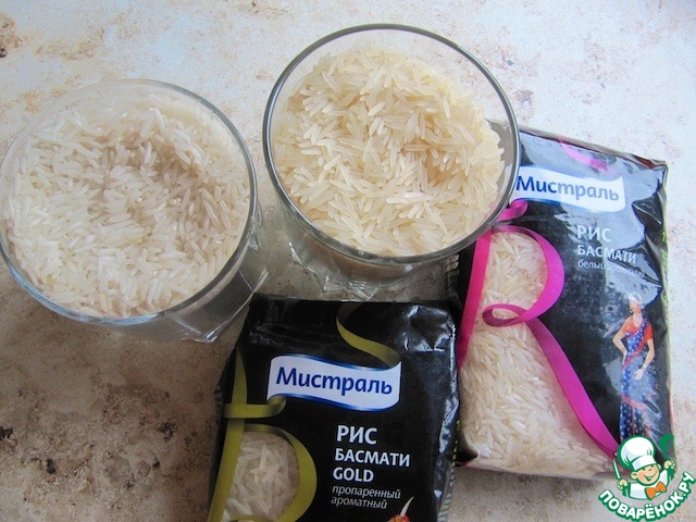 Для этого блюда я использовала рис от Мистраль: рис белый ароматный «Басмати» и рис пропаренный ароматный «Басмати Gold», по 1 стакану каждого.