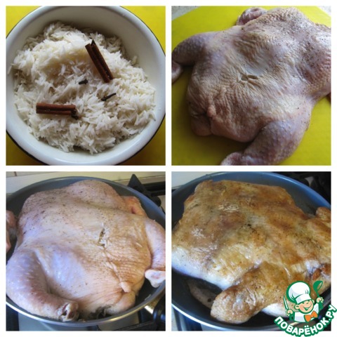 Тушку курицы посолить, поперчить. Для начинки я использовала рис пропаренный ароматный «Басмати Gold». Его нужно посолить, добавить несколько гвоздичек и палочку корицы, перемешать, начинить курицу (брюшко, окорочка, грудину), зашить, чтобы в процессе обжаривания рис не высыпался. На хорошо разогретой с растительным маслом сковородке обжарить курицу с двух сторон до румяной корочки. Переворачивать аккуратно, чтобы не повредить целостность тушки.