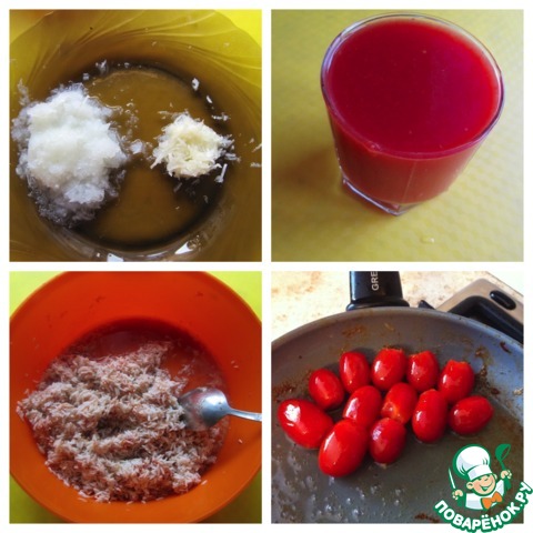 Подготавливаем второй рис - белый ароматный «Басмати». Сочный белый лук и чеснок натереть на терке, помидоры бланшировать пару минут в кипятке, очистить от кожицы, натереть на терке. Рис слегка посолить, добавить измельченные лук, чеснок, томаты, перец, мяту, перемешать. Помидоркы черри слегка притомить на оставшемся на сковородке ароматном масле.