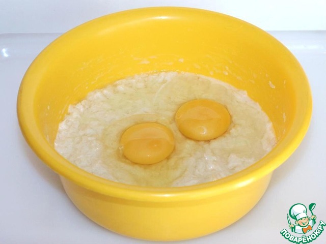 Через 8-10 минут к разбухшим хлопьям добавляем два яйца, сахар, ванильный сахар, щепотку соли и взбиваем смесь.
