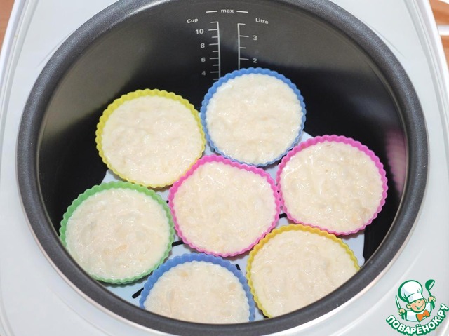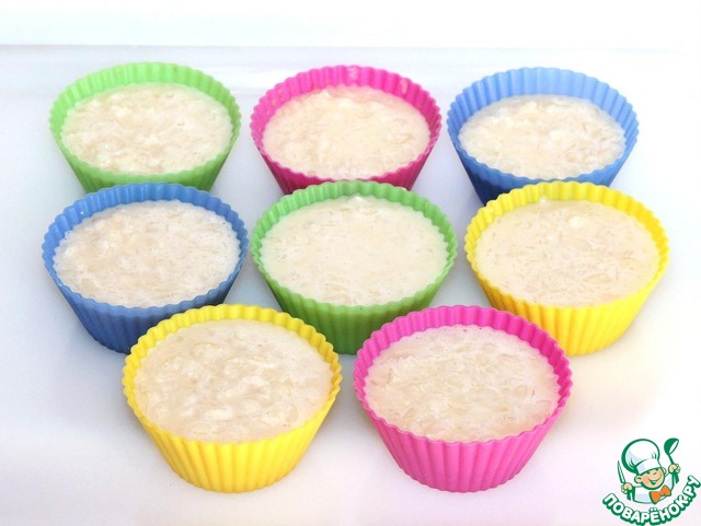 Разливаем рисовую смесь по порционным, силиконовым формочкам. Смазывать формочки не надо))).