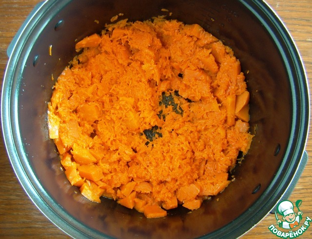 По истечении 20 минут выпечки тыквы вынимаем горшочек и слегка ее примнем толкушкой. Я оставляю и немного кусочков, люблю и целенькую тыкву в каше. Это дело вкуса - делайте так, как Вам нравится!