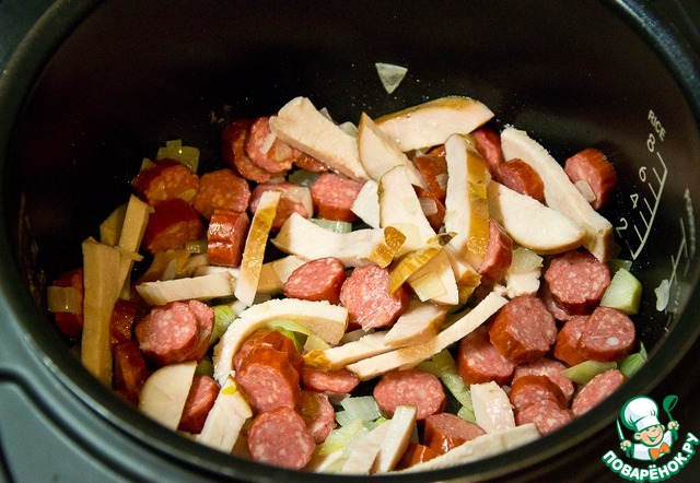 Если же используете куриную грудку, как я — сначала на растительном масле поджарьте лук, затем добавьте колбаски и грудку.