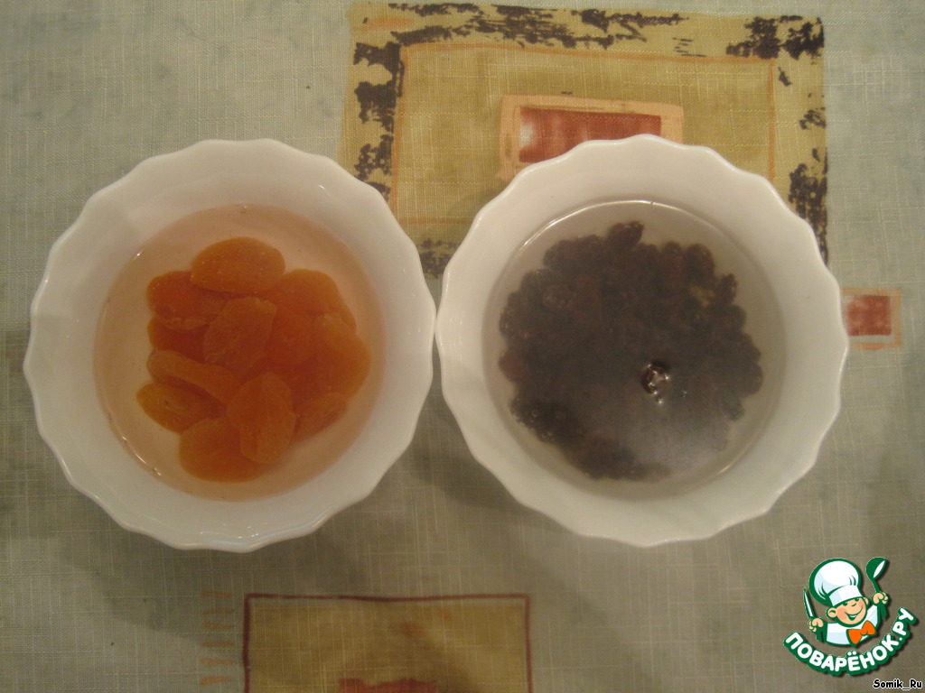 Курагу и изюм замочить в теплой воде на 15 - 20 минут.