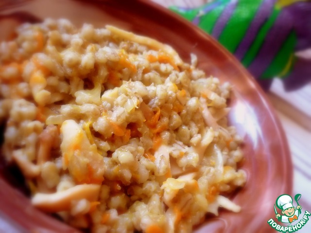 Готовую гречку смешиваете с кальмарами. Оставляете на подогреве под закрытой крышкой минут на 10.