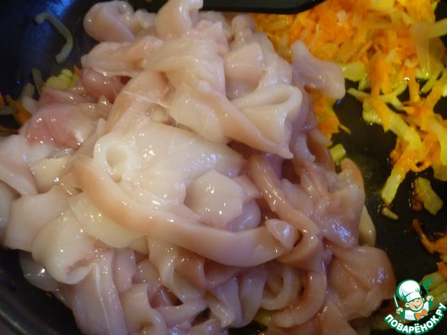 За 2 минуты до окончания программы добавляем нарезанные неширокой лапшой кальмары и перемешиваем.