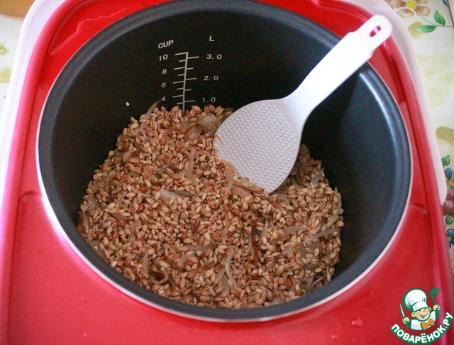 Перловку перемешиваем с пассированным луком и обжариваем минут 5-7.