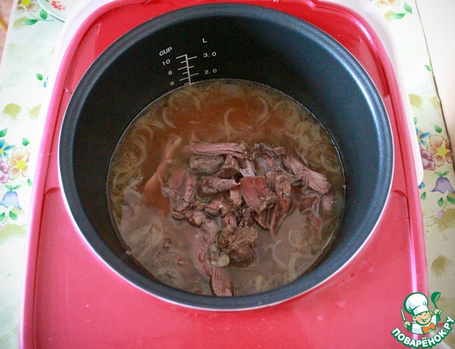 Кладём мясо в чашу мультиварки, заливаем водой, чтобы вода полностью покрыла лытку,