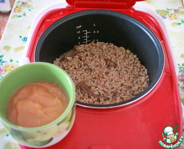 Рецепт "Перловка с говяжьей лыткой и яблочным пюре, приготовленная в мультиварке":