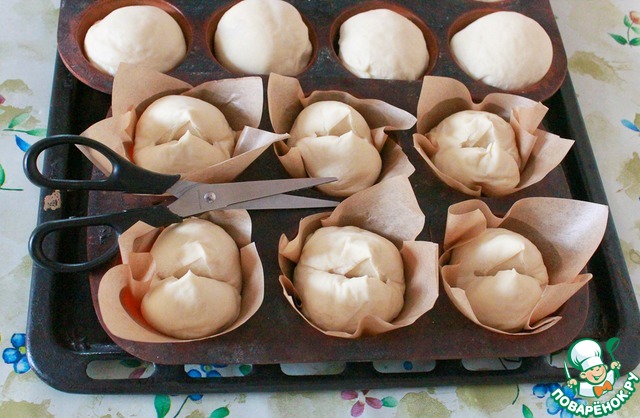 Ножницами делаем глубокие разрезы в булочках посередине, но до конца не дорезаем.