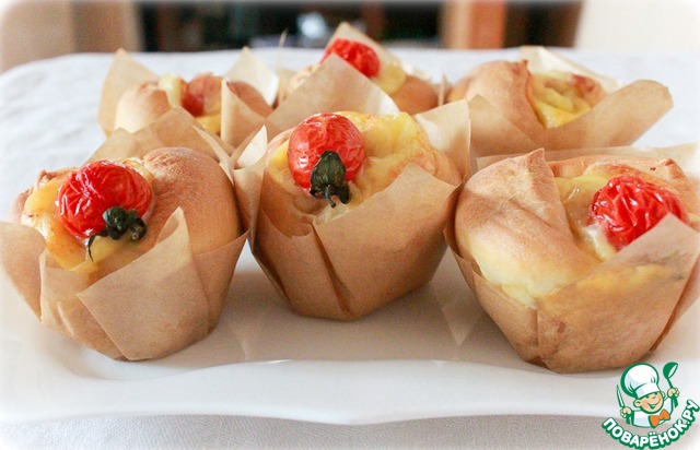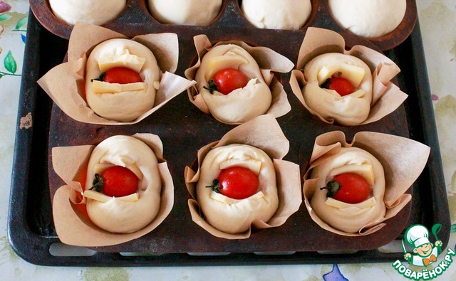 Кладём в разрезы кусочки сыра и по целой помидоре черри.