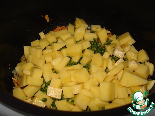 Картофель почистите, помойте и порежьте небольшими кубиками, добавьте в чашу мультиварки.