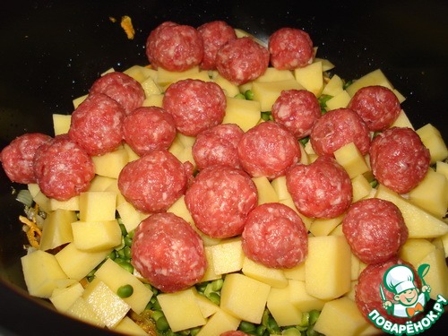 Из фарша скатайте небольшие фрикадельки и то же положите в чашу мультиварки.