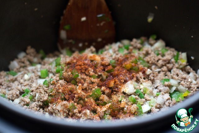 В чашу мультиварки налить немного растительного масла. Включить режим "ЖАРКА", выставить время - 40 минут. Выложить в чашу фарш. Жарить, помешивая и разбивая комки, примерно 20 минут (ориентироваться по состоянию фарша, лишний жир, если он присутствует, должен вытопиться).