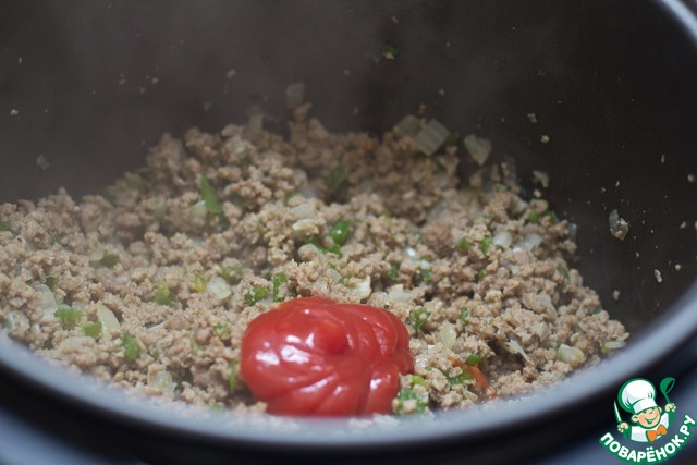 Томатную пасту развести в 250 мл воды. Влить в мясо-овощную смесь, уравновесить кисловатый вкус сахаром. Готовить до окончания программного времени.