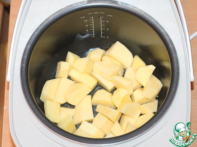 Приготовим картофель. Его необходимо очистить от кожуры, помыть, крупно порезать, засыпать в мультиварку и налить 80 мл воды.
