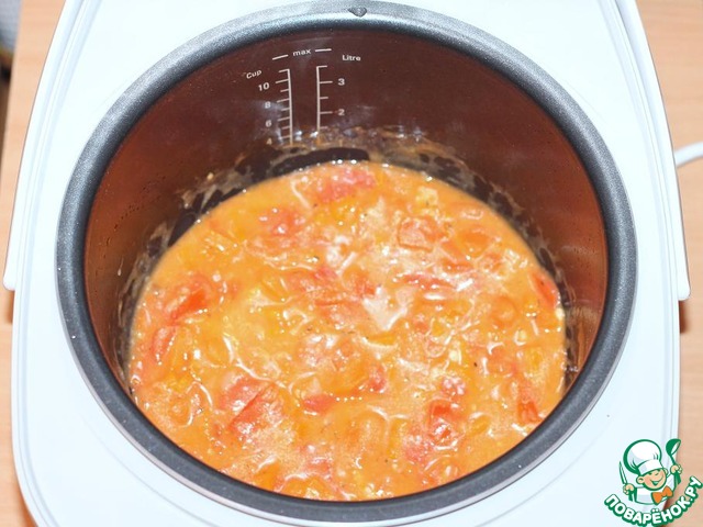 Влить в чашу мультиварки 1 ст. л. растительного масла и добавить нарезанные помидоры, морковь, 1 зубчик выдавленного чеснока и специи.