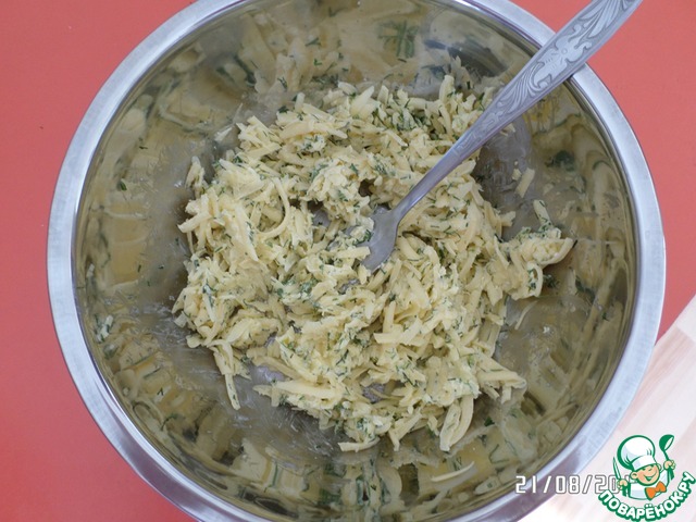 Сыр натереть на крупной терке, зелень измельчить ножом. Сыр смешать с зеленью и сливочным маслом, добавить соль.