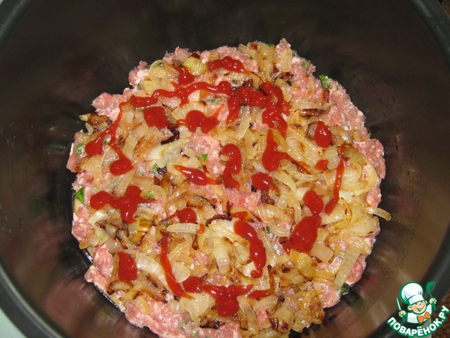 Следующие слои-мясной фарш-жареный лук-кетчуп.