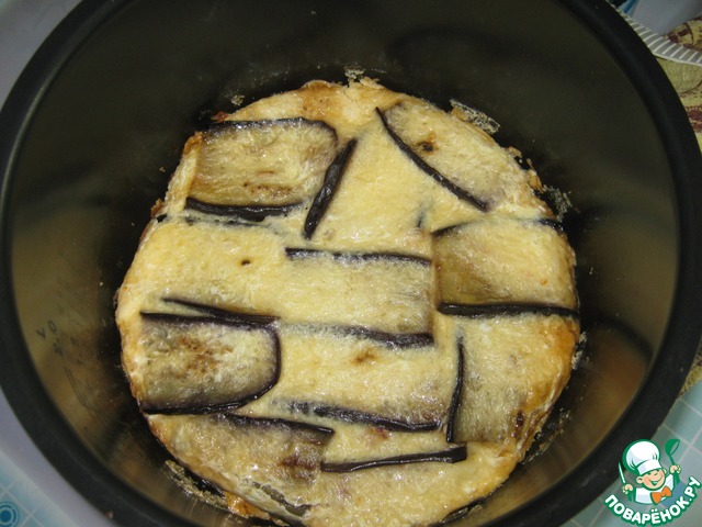 Теперь начинаем собирать нашу запеканку. Рекомендую на дно чаши положить кружок пекарской бумаги. Выкладываем слой жареных баклажан.