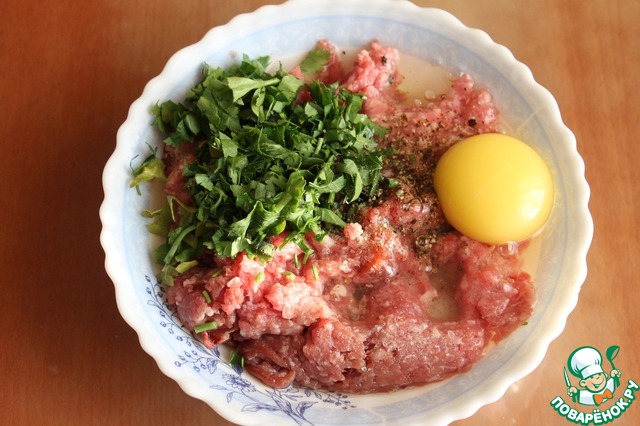 Смешать фарш, яйцо, тертый имбирь, соль, перец, херес, соевый соус, мелко порубленную зелень.