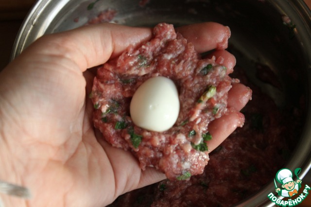 Из фарша сделать лепешечку, в центр положить перепелиное яйцо.