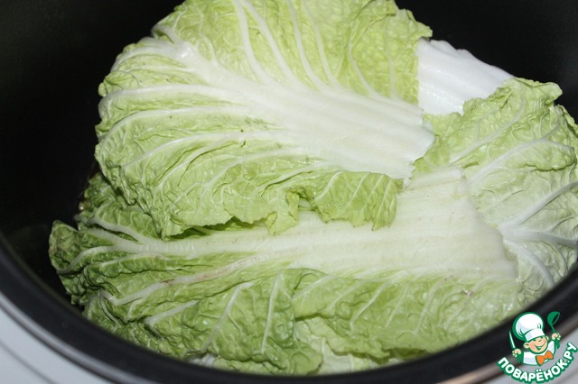 Китайскую капусту разобрать на листы и за 20 минут до окончания программы укрыть фрикадельки листами капусты, закрыть крышку и продолжить тушение.