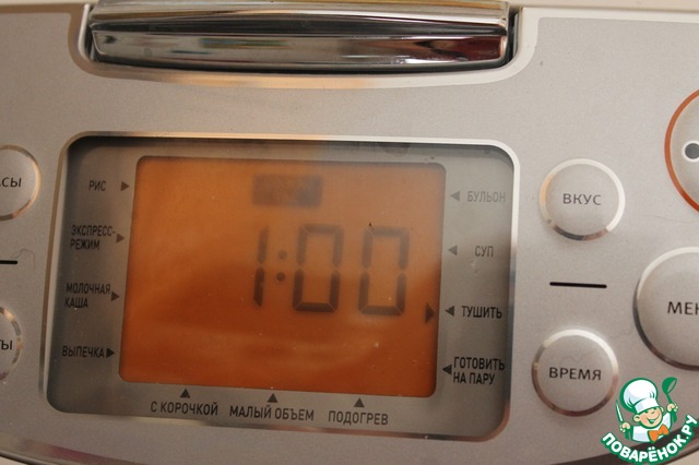 Включить мультиварку на режим "тушить" (программа выставляет 1 час, но блюдо будет готово буквально через 30 минут)