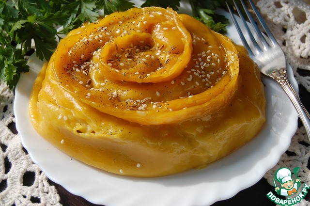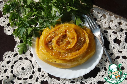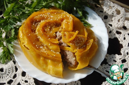 Разделитьтесто на 2 части. Скатать руками 2 колбаски и раскатать каждую из них скалкой. На центр каждой полоски выложить начинку по всей длине и аккуратно защипить края. Свернуть полоски по спирали. Круг для приготовления на пару смазать растительным маслом и выложить на него наши завитки. Готовить в течении 40 минут. Перед подачей завитки полить растопленным сливочным маслом.