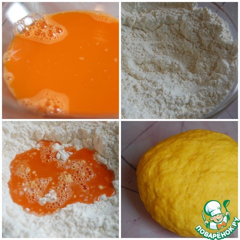 Морковный сок налить в сотейник, поставить на плиту и довести до кипения на среднем огне. В глубокую миску просеять муку вместе с солью. Сделать небольшое углубление в муке и вылить горячий морковный сок, быстро перемешать. Вымесить тесто, постепенно добавляя оливковое масло до однородности. Если тесто получилось слишком крутое добавить немного горячей воды (пару ложек). Скатать в шар, завернуть в пищевую пленку. Отложить тесто в сторону на 30 минут отдохнуть.