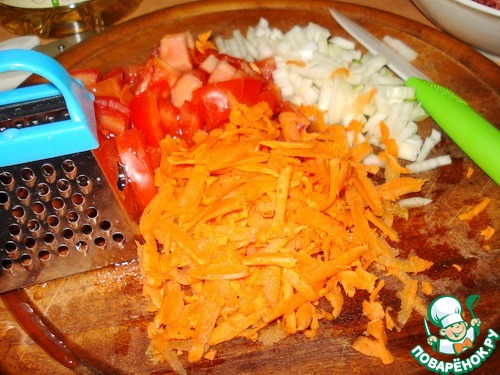 Лук и морковь очистите. На крупной терке натрите морковь. Нарежьте кусочками помидор и лук.