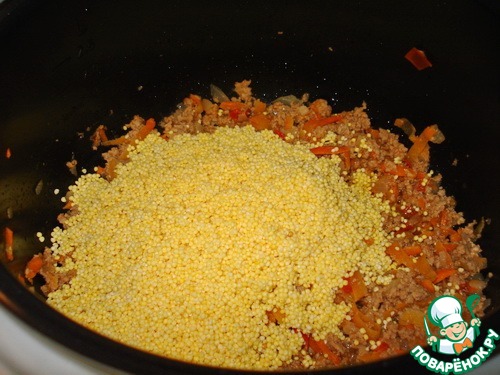 Потом фарш, немного влить воды и еще обжаривать минут 5.