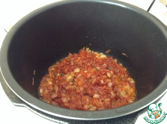В оставшиеся в мультиварке овощи добавить томатную пасту и еще минуту протушить в режиме Жарка/Фритюр (при открытой крышке).