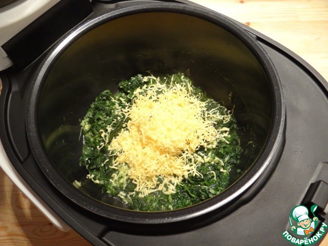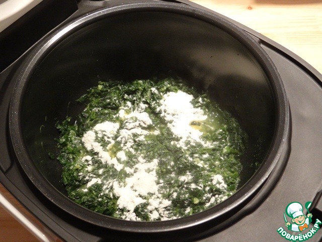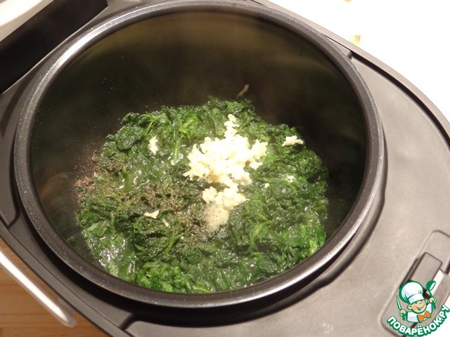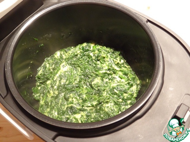 Эти лепешки я с легкостью приготовила в замечательной мультиварке Vitek VT-4205 ВК. Мультиварку включаю на программу "Поджаривание". В чашу мультиварки наливаю растительное масло, добавляю замороженный шпинат. Даю выпариться большей части жидкости.