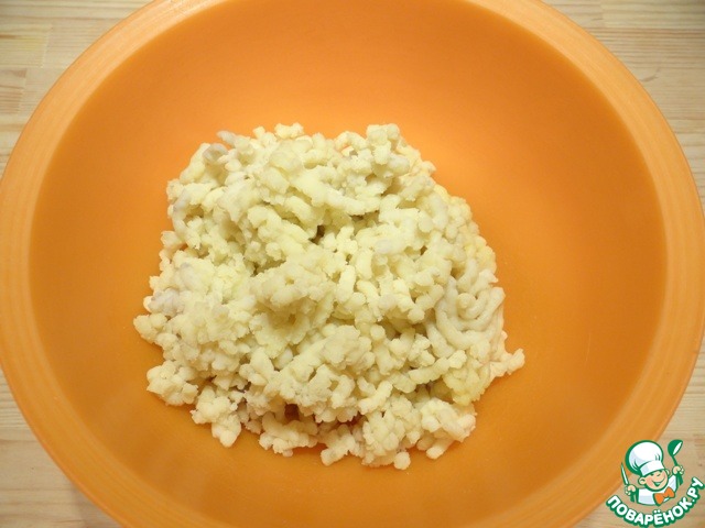 Готовлю картофельное тесто. Остывший отварной картофель пропускаю через мясорубку.
